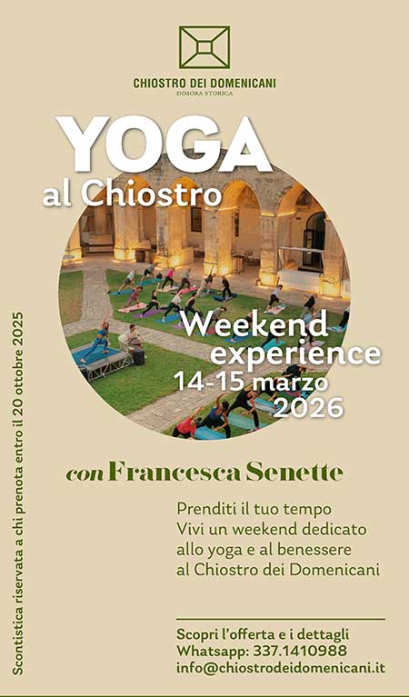 Nel silenzio armonioso del Chiostro dei Domenicani, luogo dove la storia incontra la quiete in una sinergia eterea, nasce la prima “Yoga al Chiostro Experience”: due giornate dedicate al benessere psicofisico, alla presenza e all’ascolto di sé, guidate da Francesca Senette.